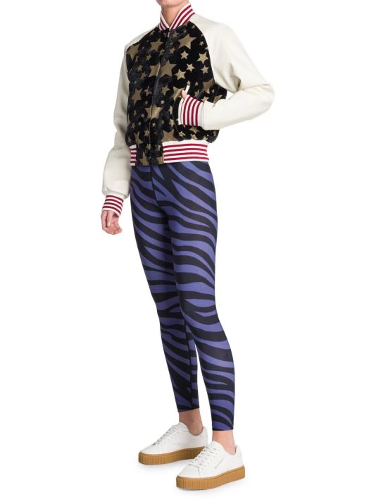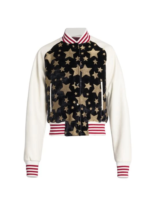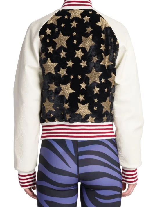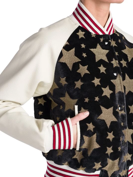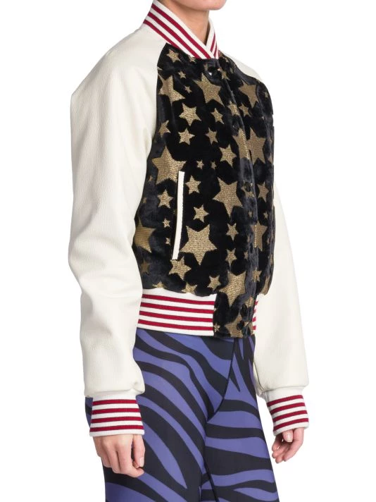 Palm Angels’ colorblocked varsity jacket boasts leather sleeves and contrast velvet sparkly star-pattern bodice.