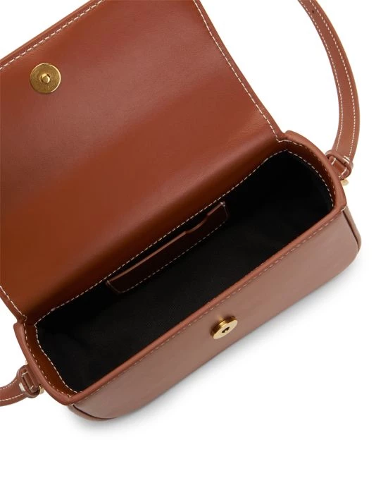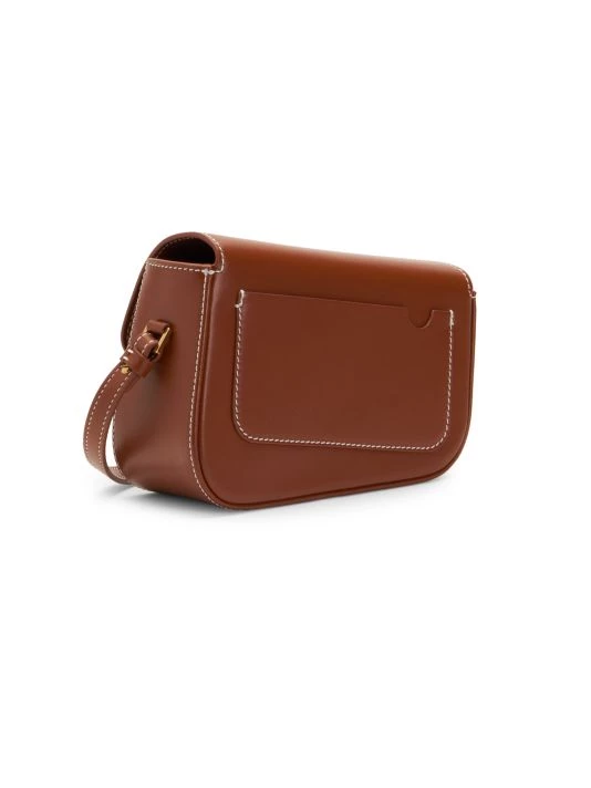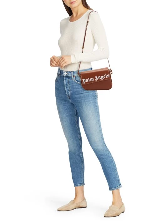 A graphic logo adorns the front of this leather crossbody bag, designed with a unique asymmetric shape and contrast stitching.