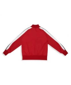 This Palm Angels track jacket is crafted of a polyester blend and is styled with a mockneck. This garment features striping down both sleeves and fastens with a center zipper.