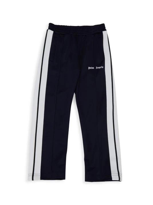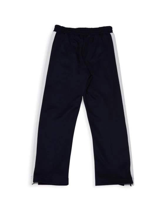 The brand’s signature track pants are detailed with a logo on the front and a striped pattern on the sides.
