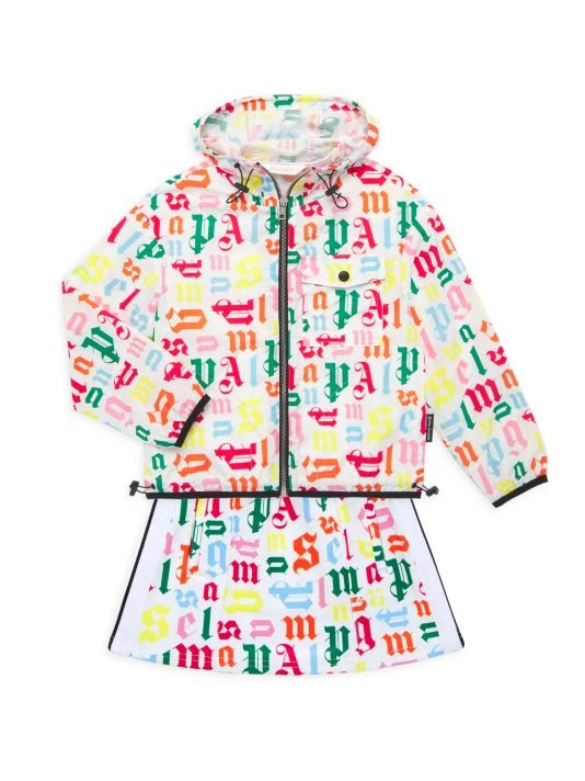 This kid’s windbreaker features an all-over logo pattern, and a drawstring hood and hem.