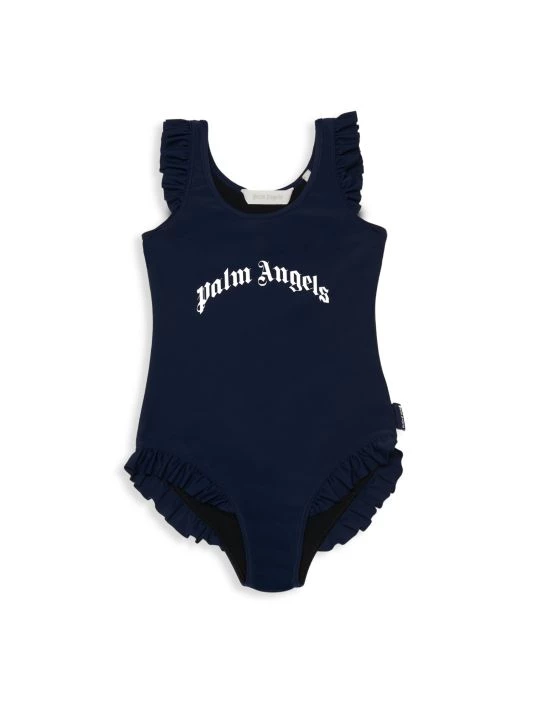 Ruffles trim this sweet one-piece swimsuit, printed with a contrast logo across the front.