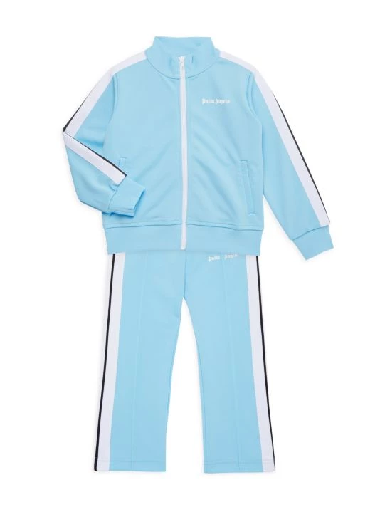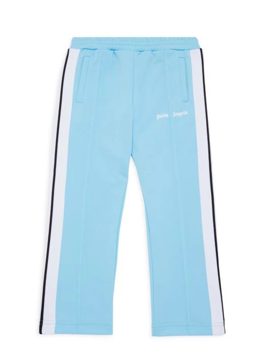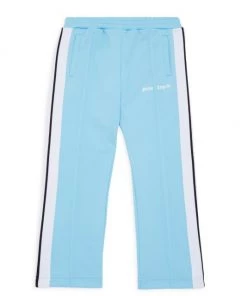 The brand’s signature track pants feature contrast stripes on the sides and a logo on the front.