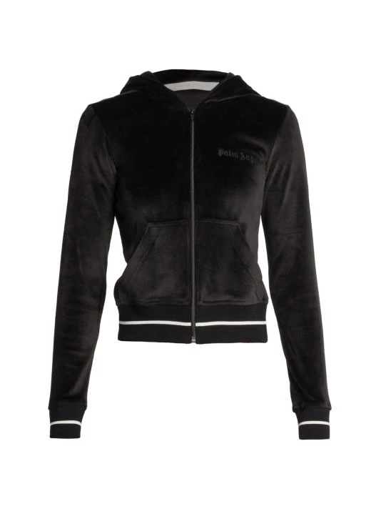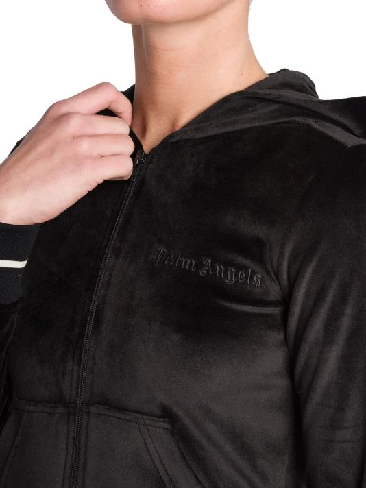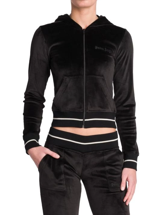 Palm Angels’ cropped velvet zip hoodie features a tonal embroidered logo at the chest. The form-fitting style is elevated by striped banded trim.