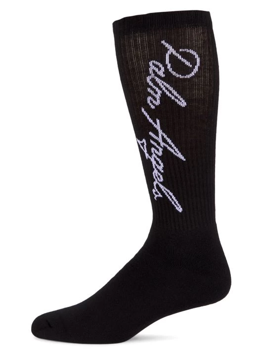 Soft stretch knit crew socks topped with signature cursive logo motif.