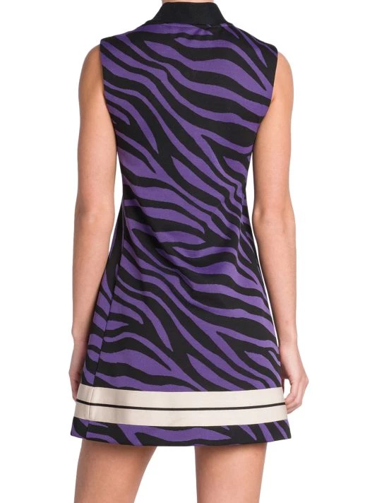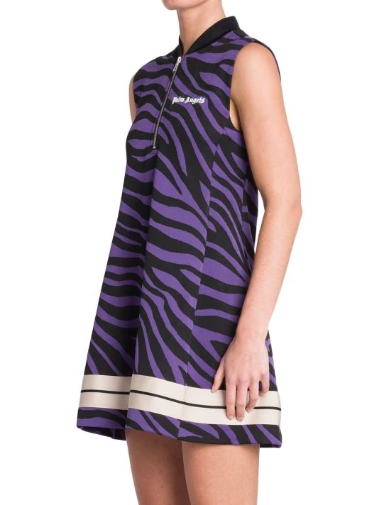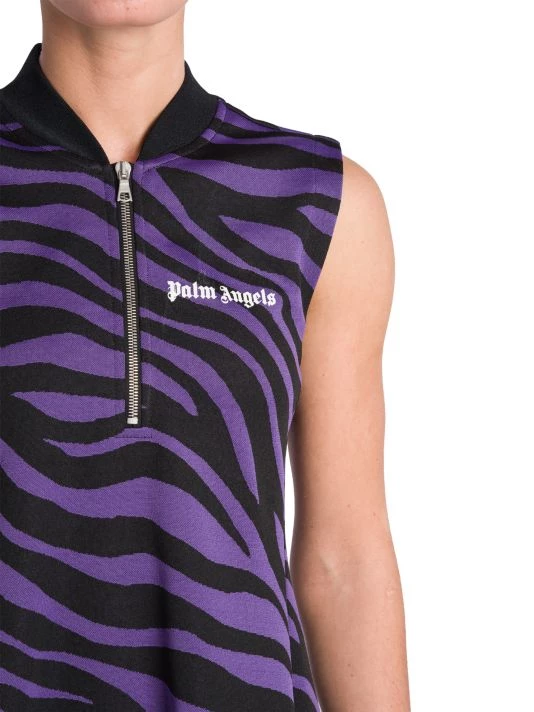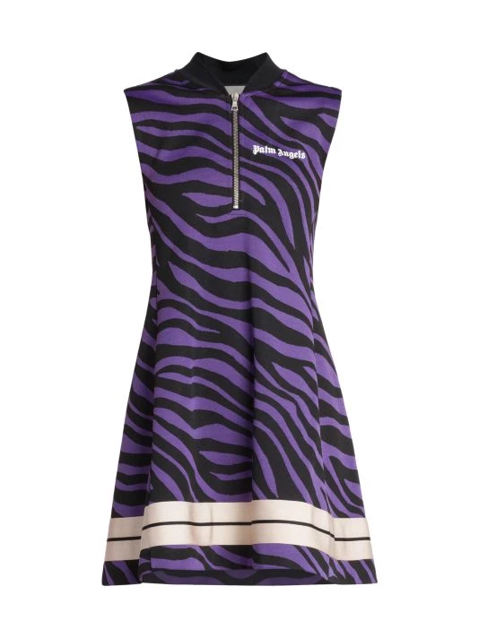 Palm Angels’ sleeveless zebra-print minidress is elevated by a contrast micro logo at the chest and striped track-inspired styling at the hem.