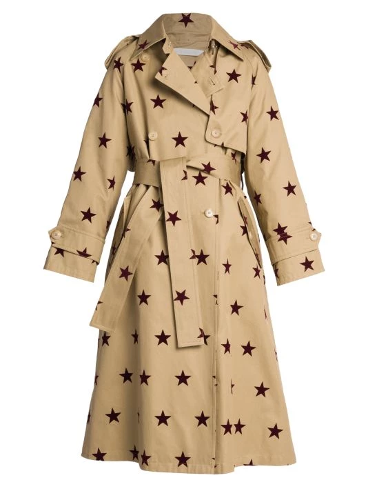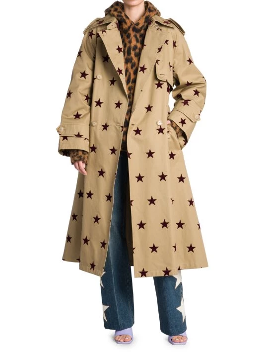 Palm Angels’ double-breasted trench coat is elevated by a contrast star pattern and tonal sash belt.